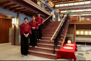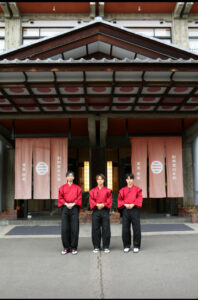 男性スタッフの新しい制服ができました。よろづや本館のイメージカラーの弁柄色(べんがらいろ)の上着と黒の袴の組み合わせです。こちら一式は当館のスタッフで、今や世界に羽ばたく⁇デザイナーのK.Tさんのデザイン縫製です。